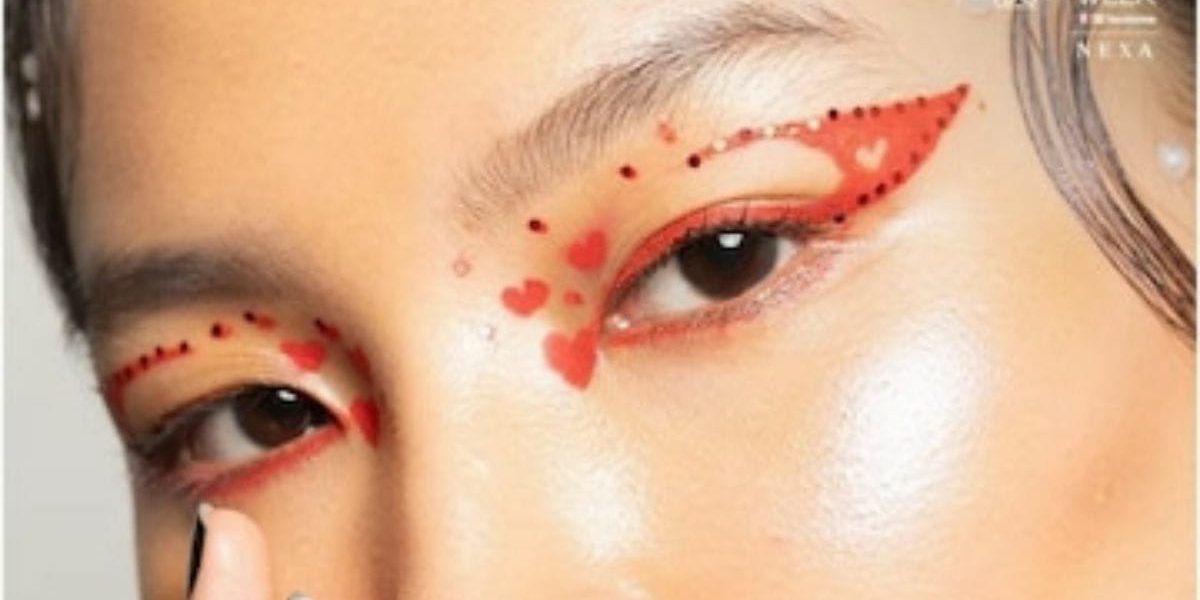 A red liner and eye shadow is going to be a rage this season which features a winged liner. Then another half line over the crease area and little hearts are created. Drawing the hearts will require a lot of practice. Add some red glitter to enhance the hearts.