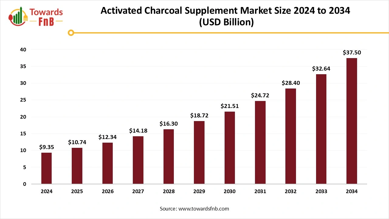 Ottawa, Nov. 05, 2025 (GLOBE NEWSWIRE) — The global activated charcoal supplement market size stood at USD 9.35 billion in 2024 and is predicted to increase from USD 10.74 billion in 2025 to reach nearly USD 37.50 billion by 2034, according to a report published by Towards FnB, a sister firm of Precedence Research. The report attributes this momentum to the rising popularity of clean-label nutraceuticals, the rapid expansion of e-commerce health retail platforms, and increased consumer awareness about digestive health and toxin removal.