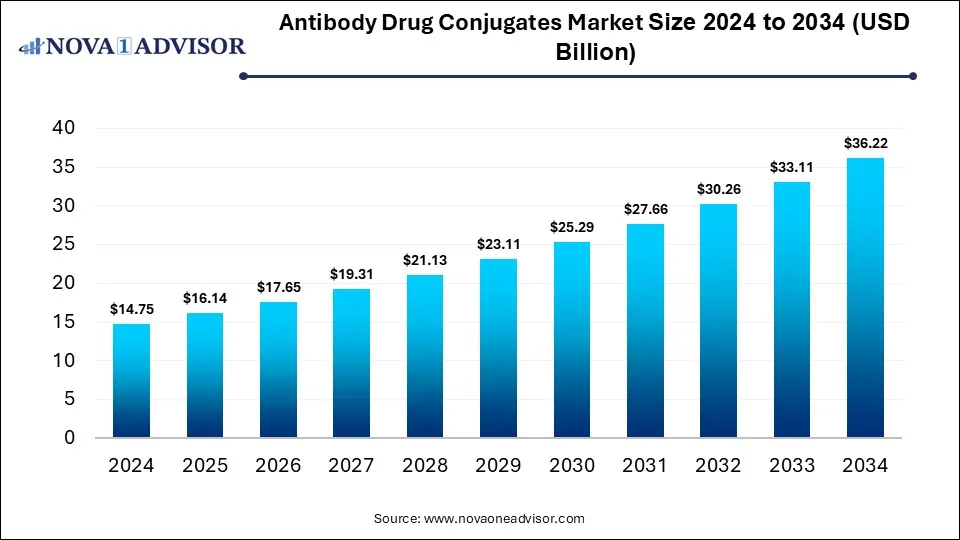 According to Nova One Advisor, the global antibody drug conjugates market size is calculated at USD 16.14 billion in 2025 and is expected to surpass around USD 36.22 billion by 2034, growing at a compound annual growth rate (CAGR) of 9.4% over the forecast period 2025 to 2034. A study published by Nova One Advisor a sister firm of Precedence Research.