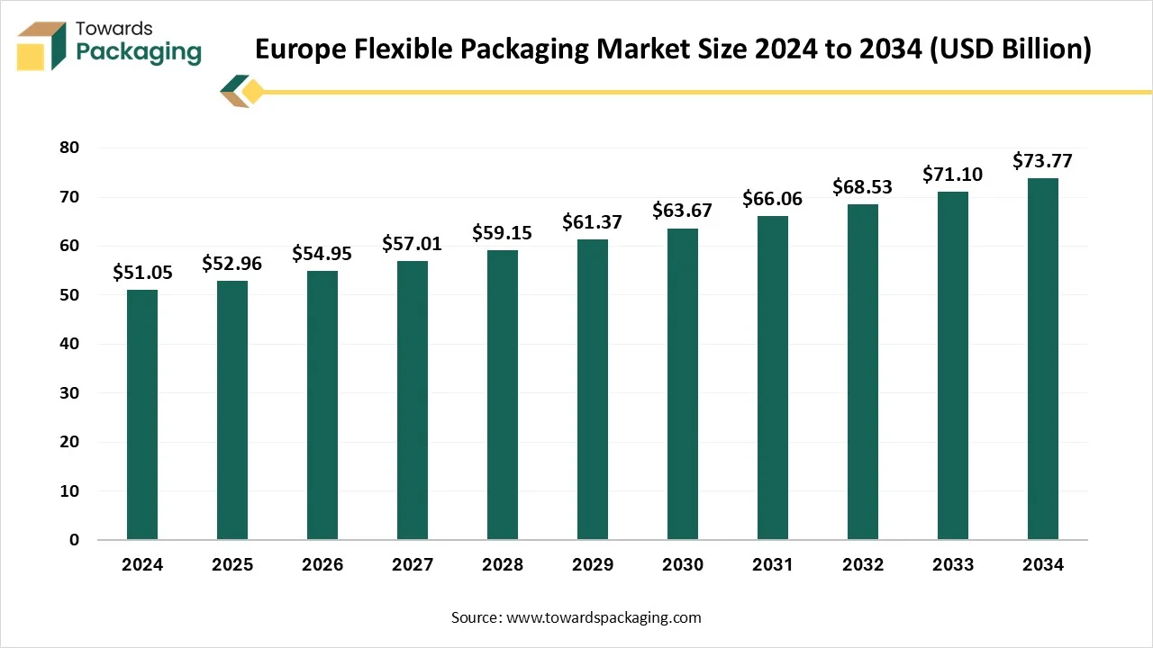 The global Europe flexible packaging market was valued at USD 52.96 billion in 2025 and is expected to grow to USD 73.77 billion in 2034, as noted in a study published by Towards Packaging, a sister firm of Precedence Research.