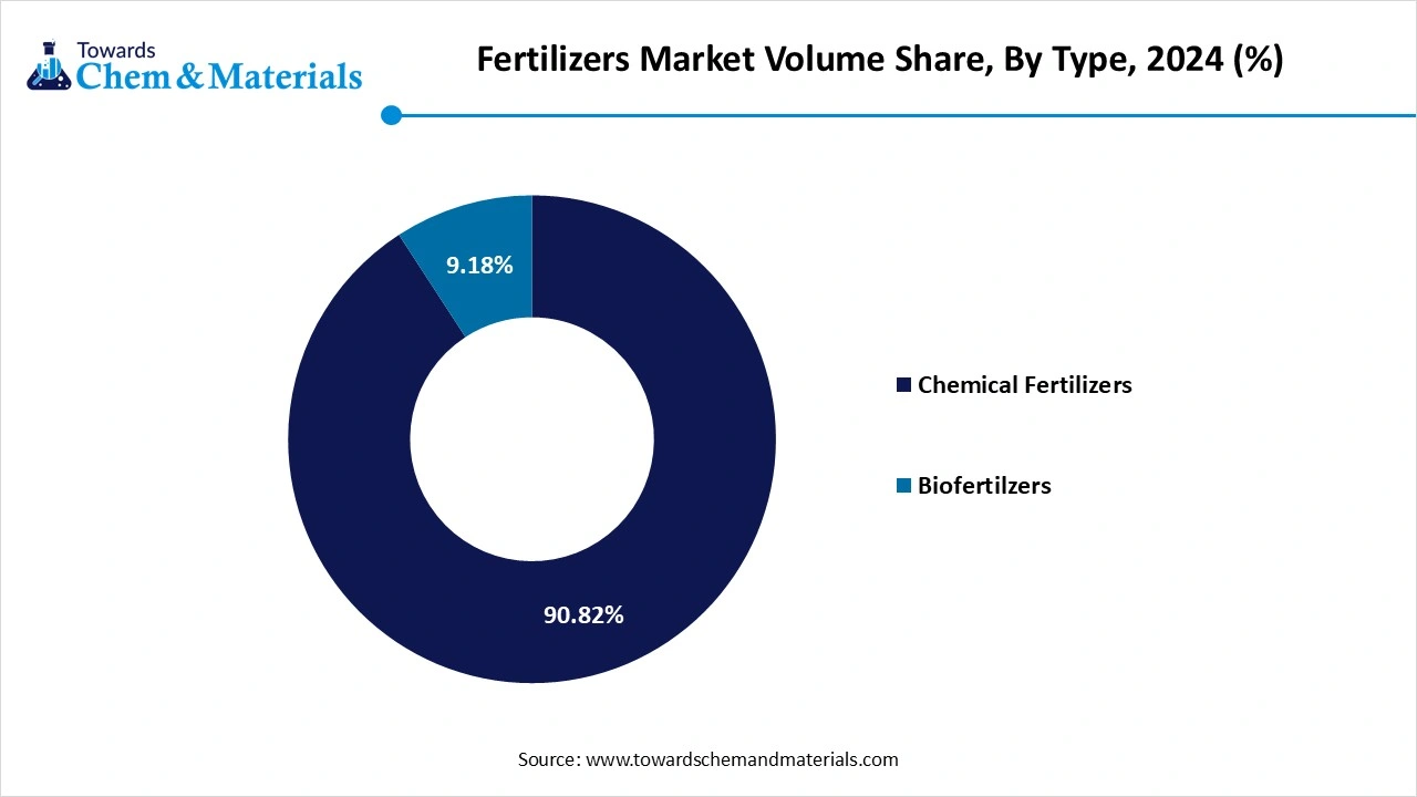 • By type, the chemical fertilizers segment led the market and accounted for the largest Volume Share of 90.82% in 2024