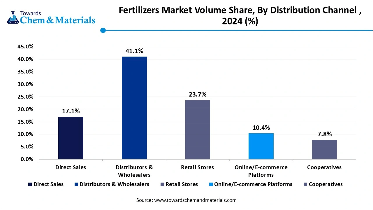 The distributors & wholesalers segment held the largest share of 41.1% in 2024. Their expansive networks, bulk handling capacity, and established relationships with manufacturers and framers enable them to serve wide geographic areas effectively. They remain the backbone of traditional fertiliser supply chains, especially in regions where remote farms and logistics challenges prevail.