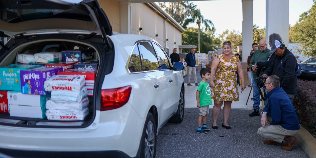 Five-year-old T.J. Moreno arrives at One More Child’s headquarters in Lakeland, Florida, with three carloads of diapers