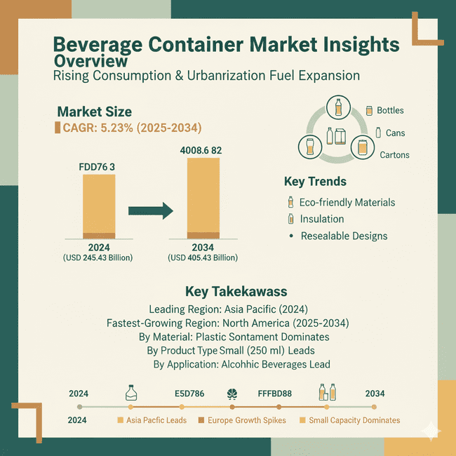 The global beverage industry is growing rapidly across packaging, container, and machinery markets, driven by sustainability, automation, and innovation. The packaging market will reach USD 275.09 B by 2034, the container market USD 408.62 B, and the packaging machinery market USD 20.06 B. Asia Pacific leads overall, while North America and Europe show strong growth. Companies like PepsiCo, Ball Corporation, and Crown Holdings are driving eco-friendly advancements, with PepsiCo targeting 100% recyclable packaging by 2025 and net-zero emissions by 2040.