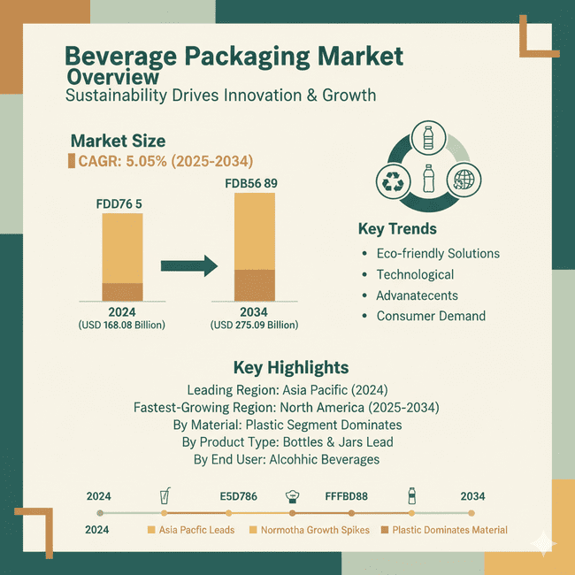 The global beverage packaging market is projected to grow from USD 176.57 billion in 2025 to USD 275.09 billion by 2034, registering a CAGR of 5.05% during the forecast period.