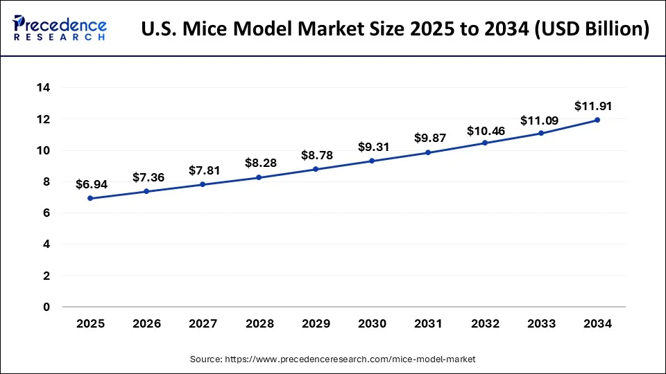 The U.S. mice model market size is calculated at USD 6.94 billion in 2025 and is projected to increase from USD 7.36 billion in 2026 to USD 11.91 billion by 2034, registering a solid CAGR of 6.16% from 2025 to 2034.