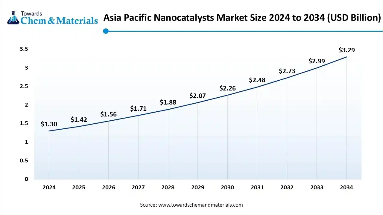 The Asia Pacific nanocatalysts market size is valued at USD 1.42 billion in 2025 and is expected to reach USD 3.29 billion by 2034, growing at a CAGR of 9.73% from 2025 to 2034. Asia Pacific dominated the market with an approximate share of 45% in 2024.