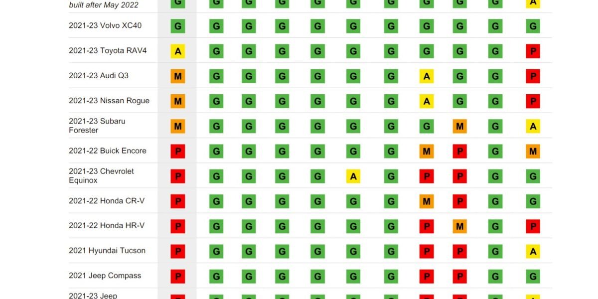 The Toyota RAV4 earns an acceptable rating, and the Audi Q3, Nissan Rogue and Subaru Forester are rated marginal. Another nine vehicles — the Buick Encore, Chevrolet Equinox, Honda CR-V, Honda HR-V, Hyundai Tucson, Jeep Compass, Jeep Renegade, Mazda CX-5 and Mitsubishi Eclipse Cross — are rated poor.