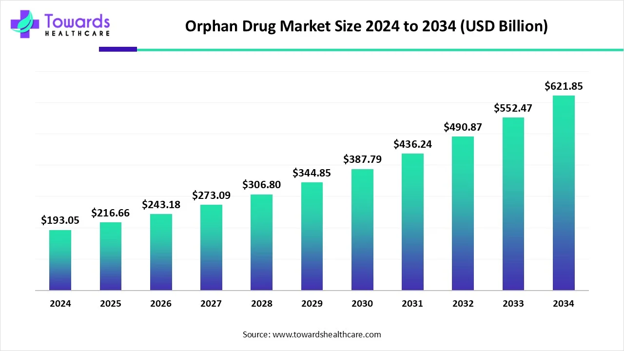 Ottawa, Nov. 10, 2025 (GLOBE NEWSWIRE) — The global orphan drug market size was valued at USD 193.05 billion in 2024 and is predicted to hit around USD 621.85 billion by 2034, rising at a 12.24% CAGR, a study published by Towards Healthcare a sister firm of Precedence Research. The global orphan drug market is driven by the increasing incidence of rare diseases and growing innovations.