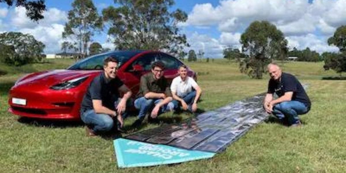 The Charge Around Australia project will power a Tesla electric car with 18 of the team’s printed plastic solar panels, each 18 metres (59 feet) long, rolling them out beside the vehicle to soak up sunlight when it needs a charge.