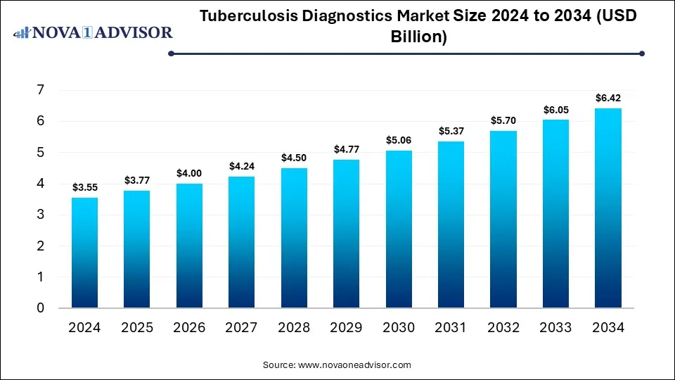 According to Nova One Advisor, the global tuberculosis diagnostics size is calculated at USD 3.77 billion in 2025 and is expected to be worth around USD 6.42 billion by 2034, growing at a compound annual growth rate (CAGR) of 6.1% over the forecast period 2025 to 2034. A study published by Nova One Advisor a sister firm of Precedence Research.