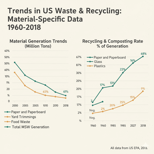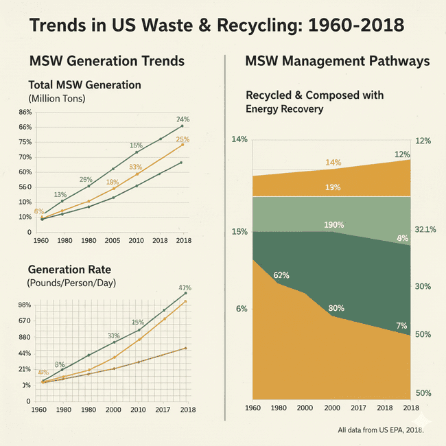 Over the past several decades, the landscape of waste generation and management in the U.S. has changed dramatically. Total MSW generation rose from 88.1 million tons in 1960 to 292.4 million tons in 2018, reflecting population growth and changing consumption patterns.