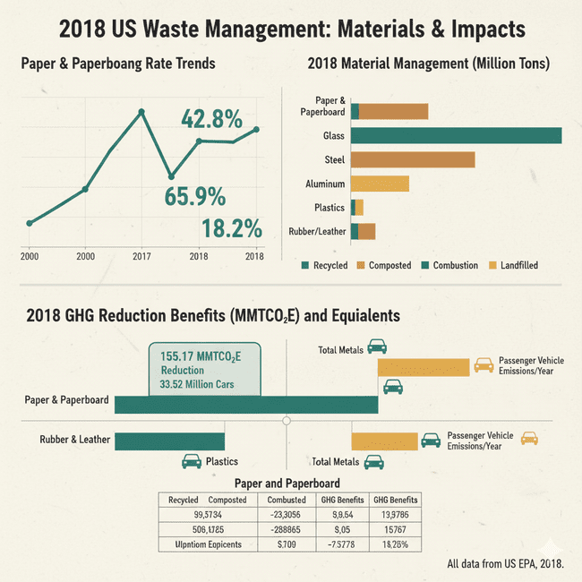 The U.S. EPA’s 2018 report highlights major progress in waste management and recycling. The nation generated 292.4 million tons of municipal solid waste, recycling over 69 million tons — with paper and paperboard making up nearly 67% of total recycling. Recycling rates for paper reached 68.2%, cutting 155 million metric tons of CO₂ emissions, equal to removing 33 million cars from the road. While plastics and food waste still dominate landfills, overall recycling and energy recovery have grown, and landfilling has dropped to 50%, marking steady progress toward sustainability.