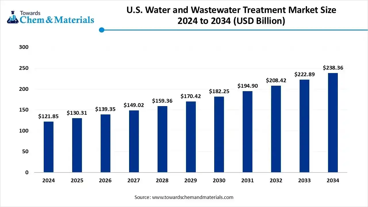 According to Towards Chemical and Materials, the U.S. water and wastewater treatment market size is valued at USD 130.31 billion in 2025 and is forecasted to reach around USD 238.36 billion by 2034, growing at a compound annual growth rate (CAGR) of 6.94% over the forecast period from 2025 to 2034.