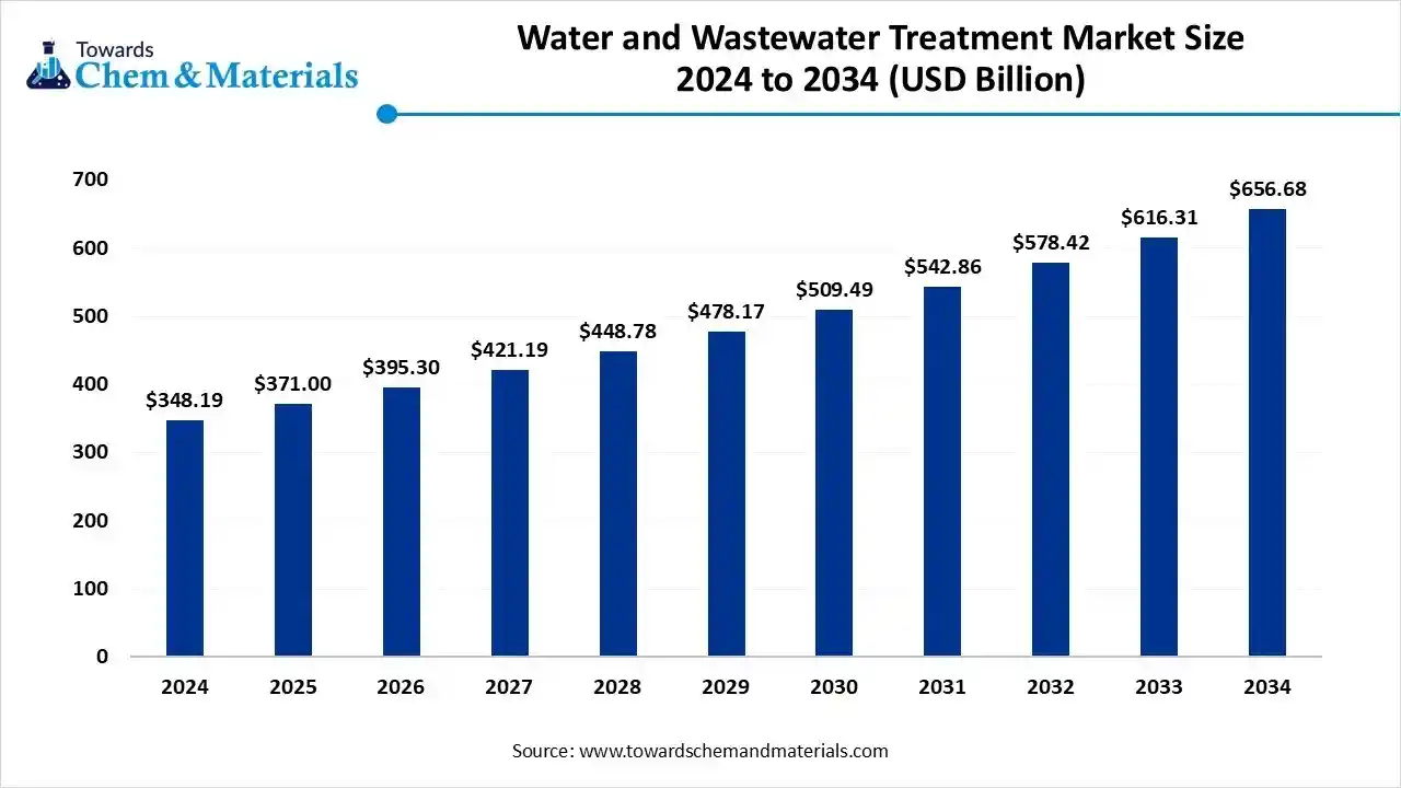 The global water and wastewater treatment market size is calculated at USD 348.19 billion in 2024, grew to USD 371.00 billion in 2025, and is projected to reach around USD 656.68 billion by 2034. The market is expanding at a CAGR of 6.55% between 2025 and 2034. The increasing water scarcity issues, growing manufacturing activities, and stricter regulations for water quality drive the market growth.