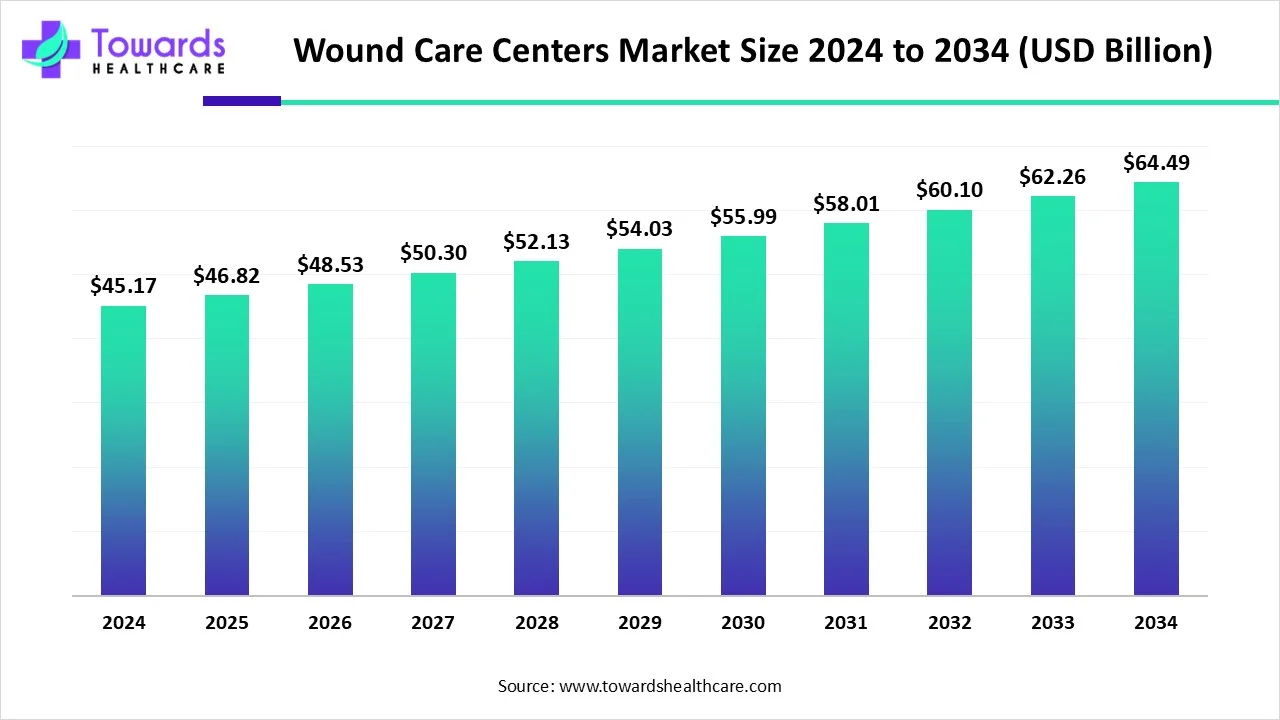 Ottawa, Nov. 12, 2025 (GLOBE NEWSWIRE) — The global wound care centers market size was valued at USD 45.17 billion in 2024 and is predicted to hit around USD 64.49 billion by 2034, rising at a 3.64% CAGR, a study published by Towards Healthcare a sister firm of Precedence Research.